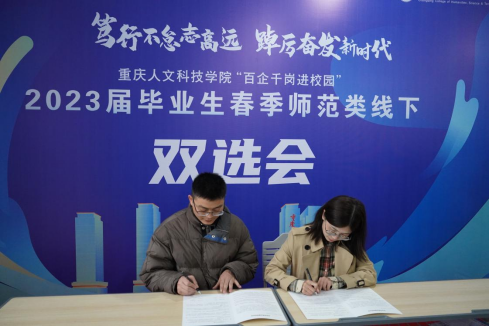 会场开设合作签约区域,外国语学院和重庆英豪教育信息咨询服务公司在现场签订就业基地协议。